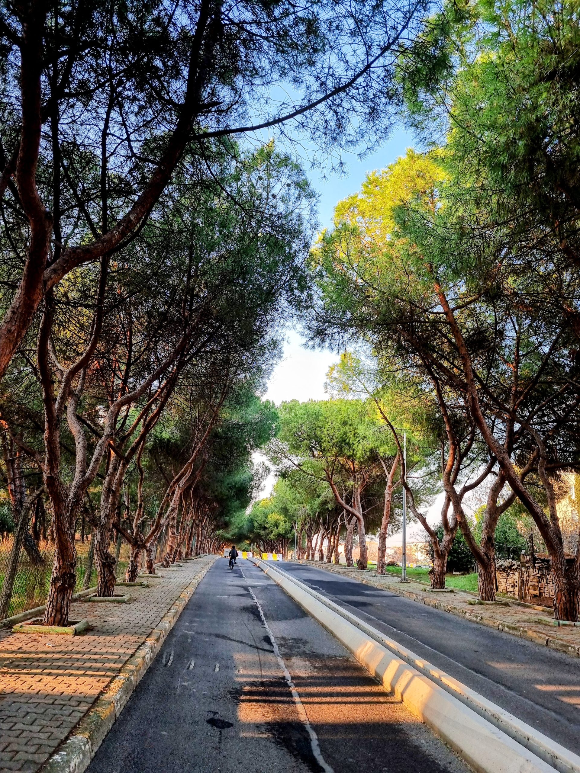 Eskiden işçilerin servis beklediği, kamyonların yük taşıdığı bu yol, fabrikanın taşınmasıyla birlikte adeta kendi sessizliğini ilan etmiş. Şimdilerde yolun her iki yanını devasa birer sütun gibi kaplayan çam ağaçları, gökyüzünü neredeyse tamamen kapatarak size yeşil bir tünelin içinden geçiyormuşsunuz hissi veriyor.